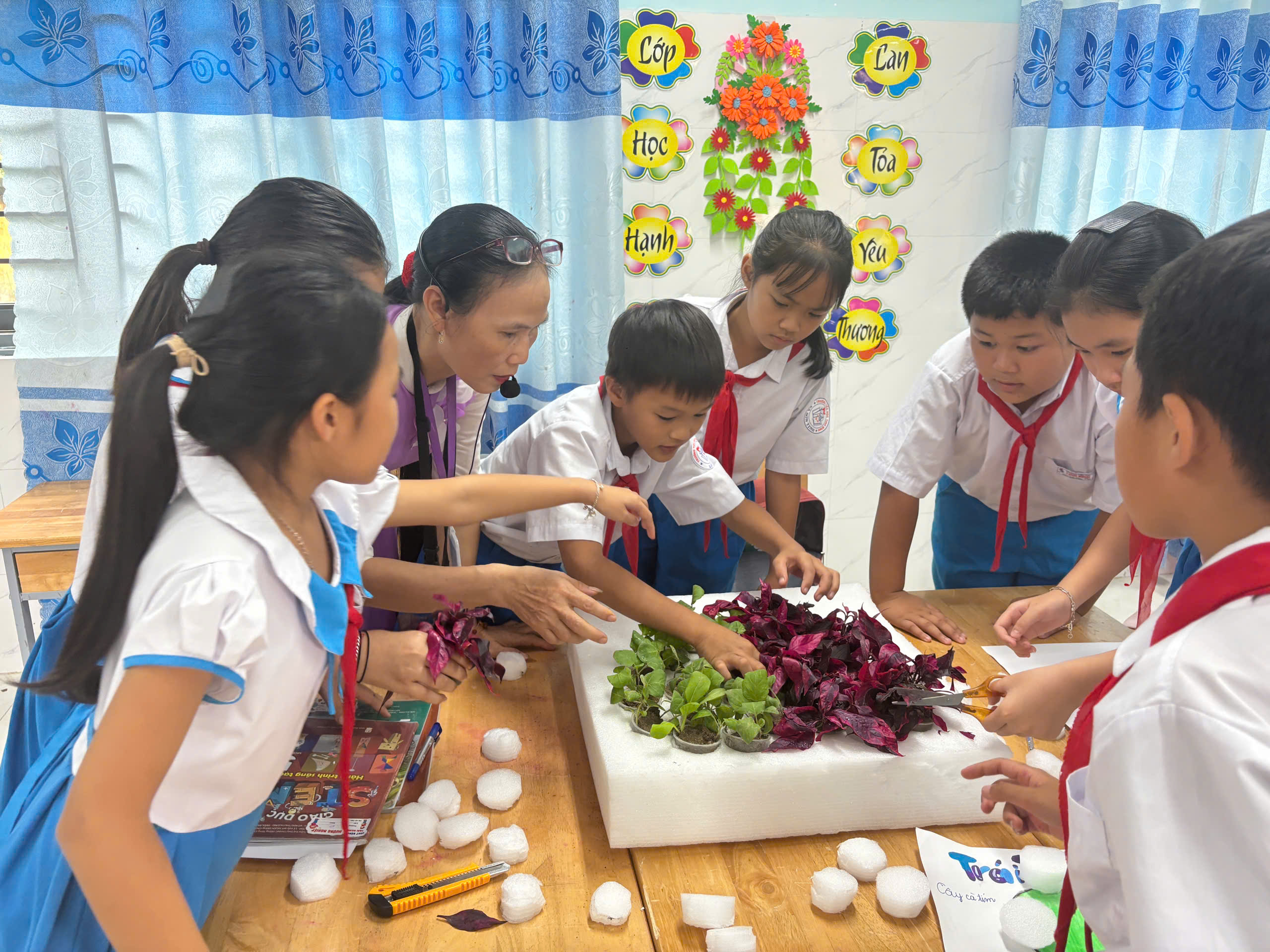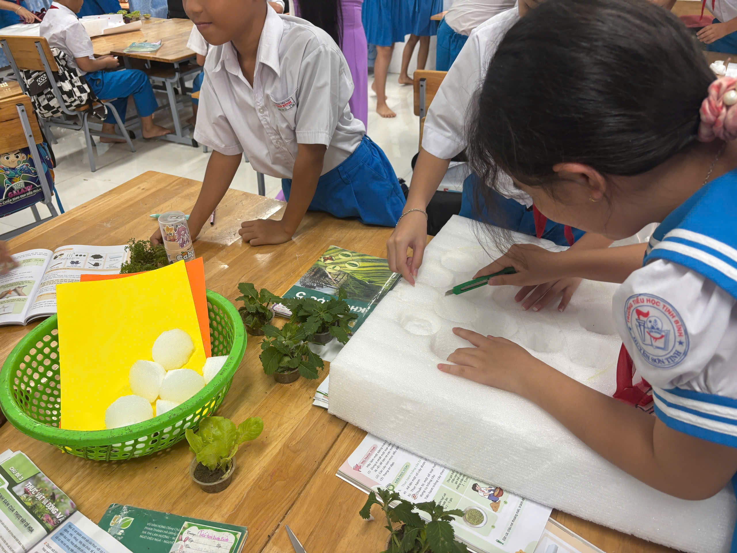 Học sinh cùng nhau thiết kế và trang trí “Bảng hiệu” – một sản phẩm đơn giản mà sáng tạo, thể hiện mô hình trồng cây bằng xốp, bút chì, ,…Hoạt động này không chỉ rèn luyện kỹ năng khéo tay, óc thẩm mỹ mà còn khơi gợi khả năng sáng tạo, trình bày cảm xúc và phát triển tư duy ngôn ngữ.